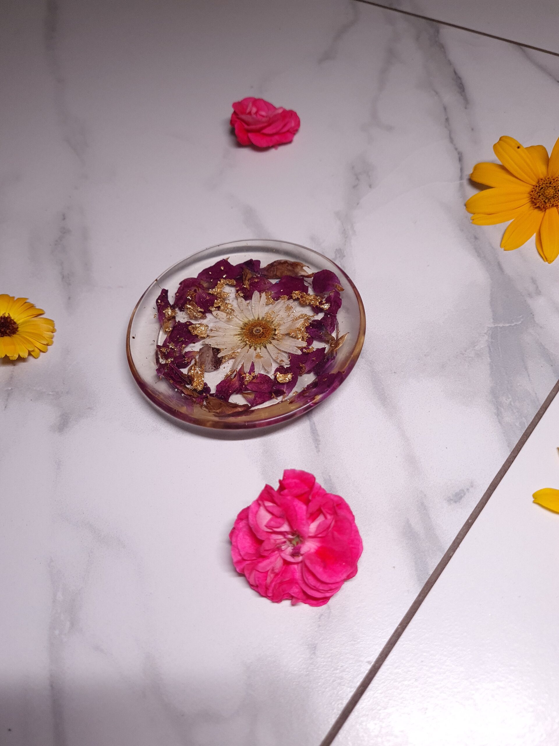 Wprowadź odrobinę magii do swojej codziennej rutyny z wyjątkową filiżanką wykonaną z transparentnej żywicy. Wewnątrz filiżanki i spodeczka zatopione zostały prawdziwe płatki róży oraz kwiaty złocienia które nadają romantycznego, subtelnego charakteru. Całość dopełnia delikatny złoty akcent, dodający elegancji i luksusowego wykończenia.