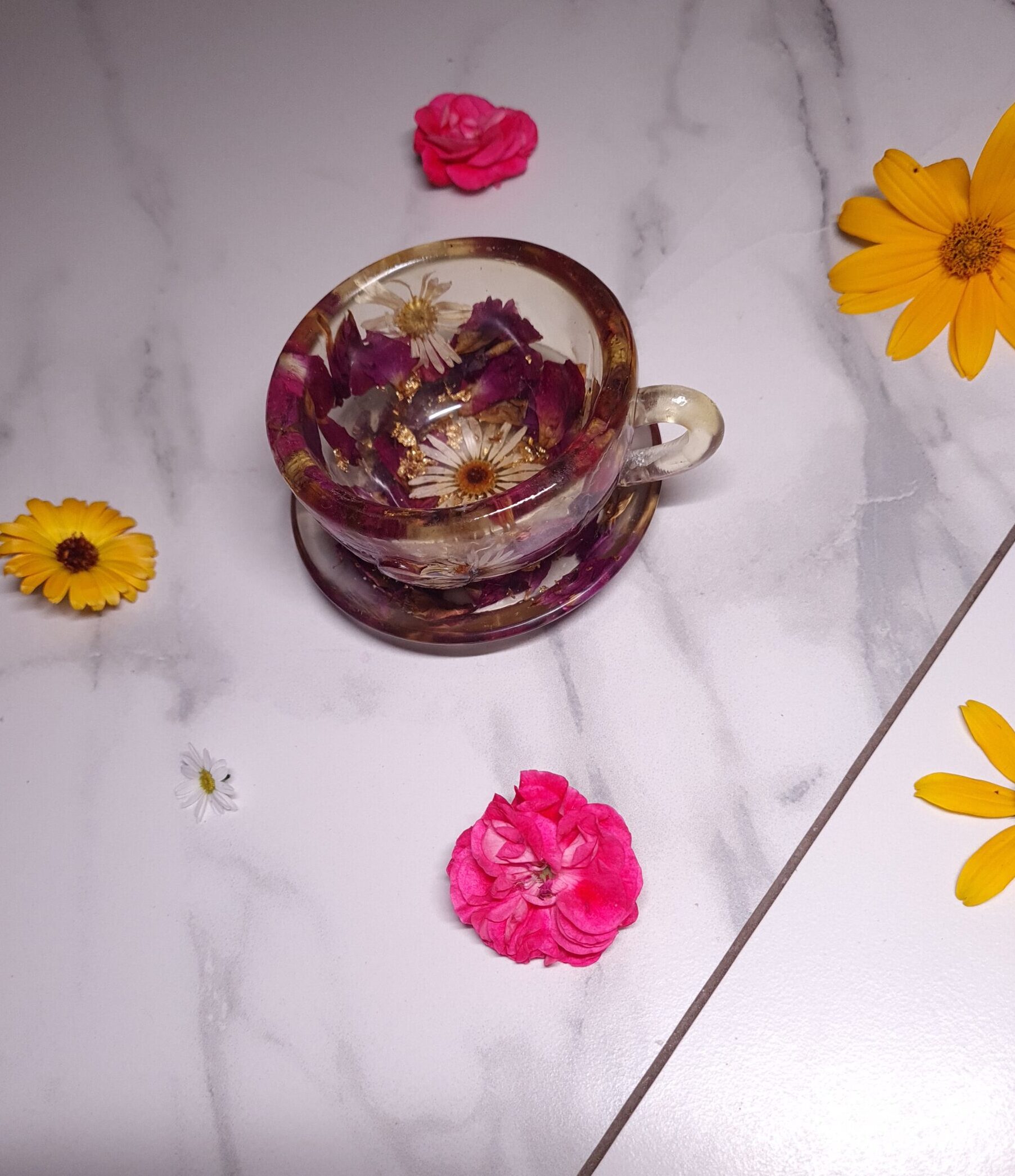Filiżanka z żywicy ze spodeczkiem – Róża złocień & Złoto