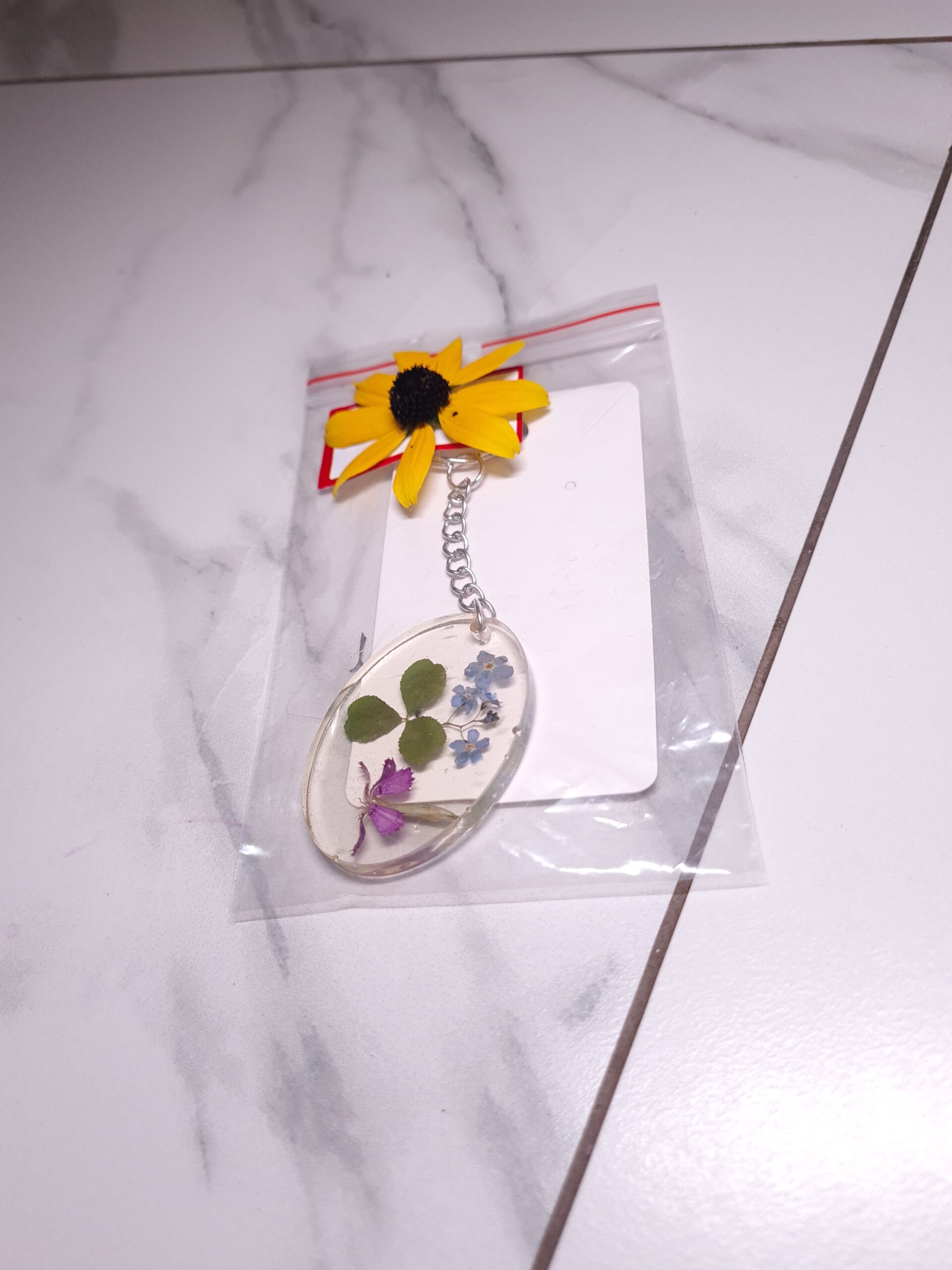 Materiał : żywica z zatopionymi kwiatami, breloczek z żelaza.
