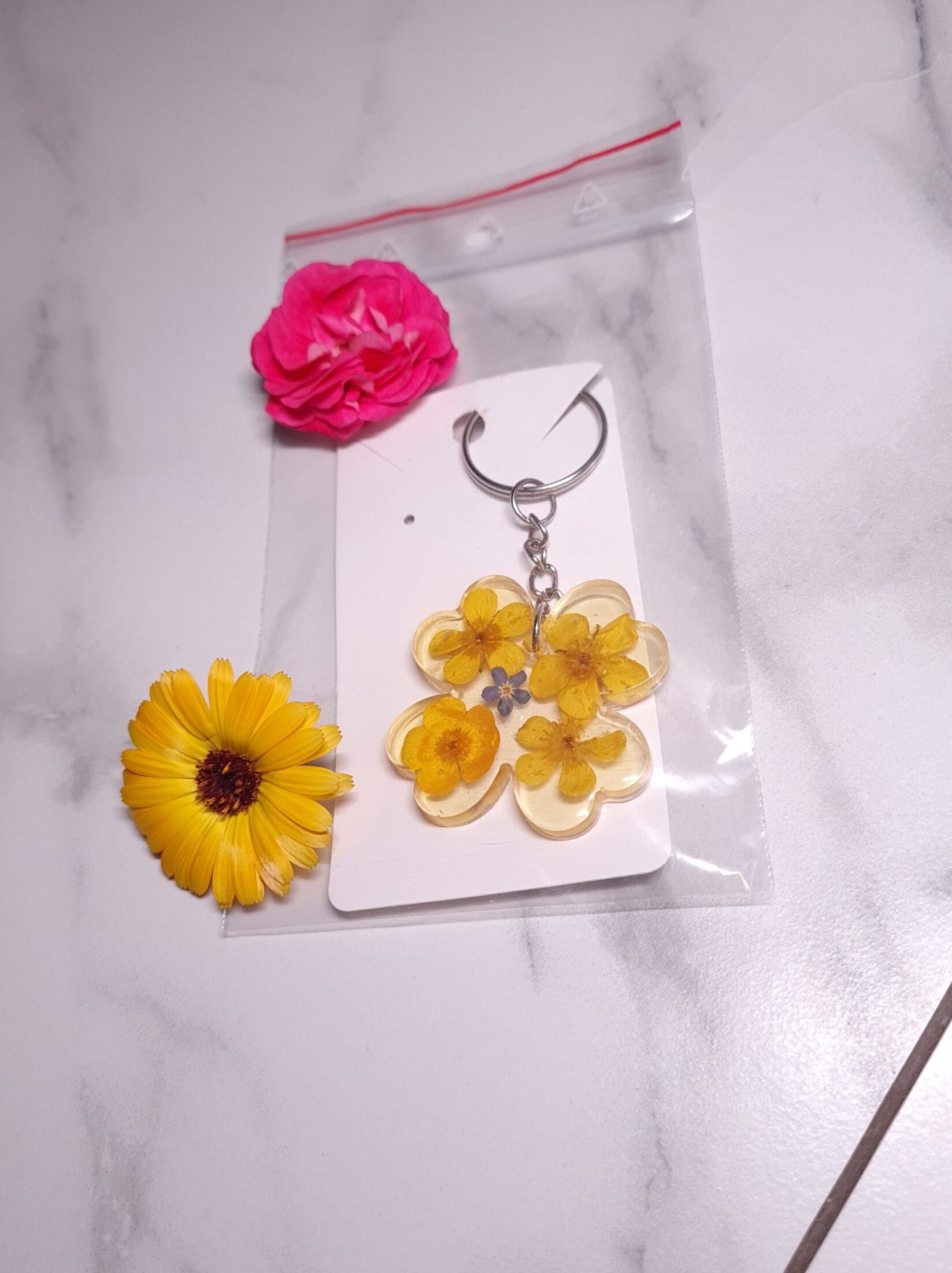 Materiał : żywica z zatopionymi kwiatami niezapominajki i jaskra, breloczek z żelaza.