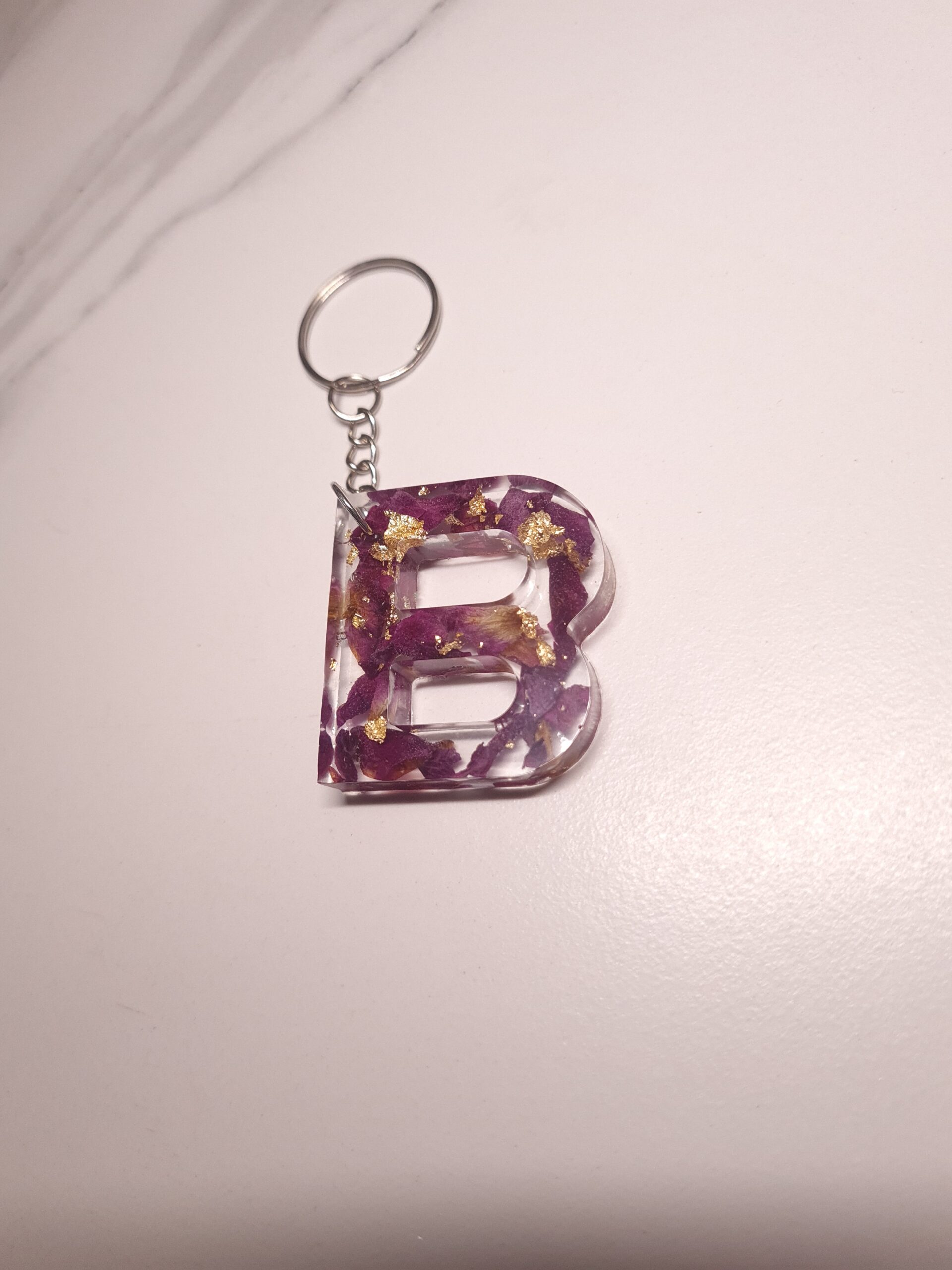 Personalizowany breloczek z żywicy – literka z płatkami róży i złotym akcentem