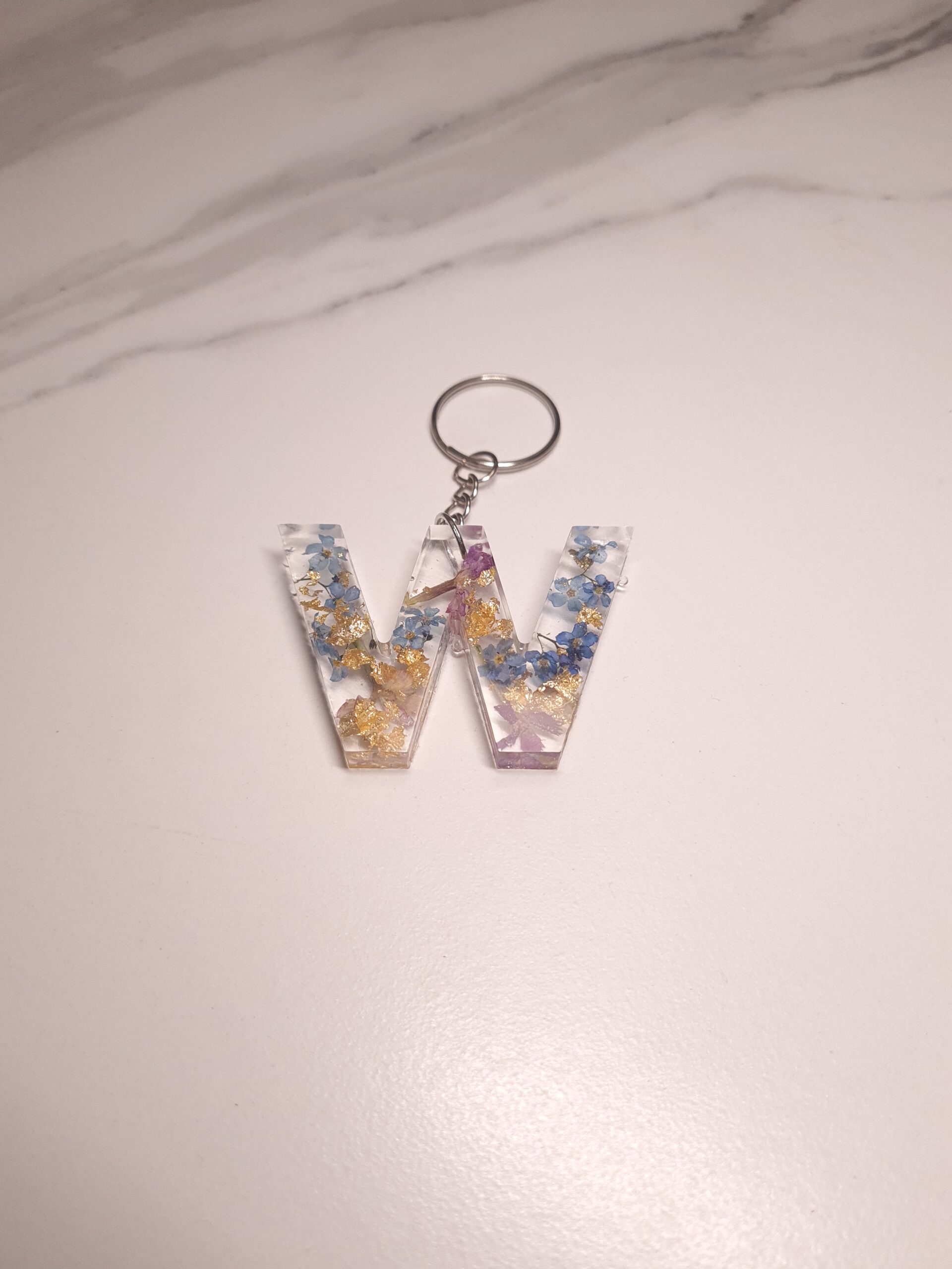 Personalizowany breloczek z żywicy – literka z niezapominajkami, goździkami i złotym akcentem