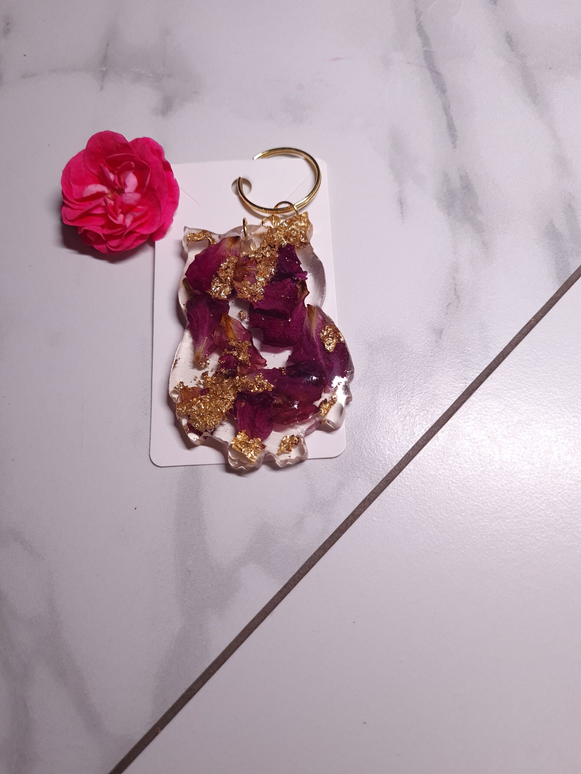 Materiał : żywica z zzatopionyi płatkami róż, breloczek z żelaza.