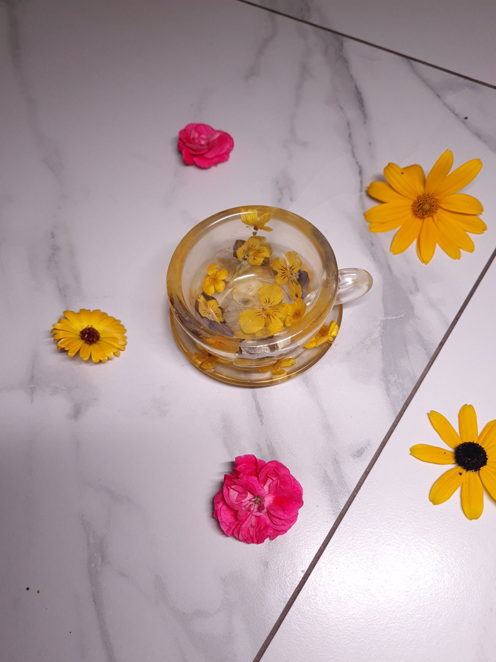 Wprowadź odrobinę magii do swojej codziennej rutyny z wyjątkową filiżanką wykonaną z żywicy. Wewnątrz filiżanki i spodeczka zatopione zostały prawdziwe kwiaty bratków i jaskrów, które nadają wiosennego, subtelnego charakteru.