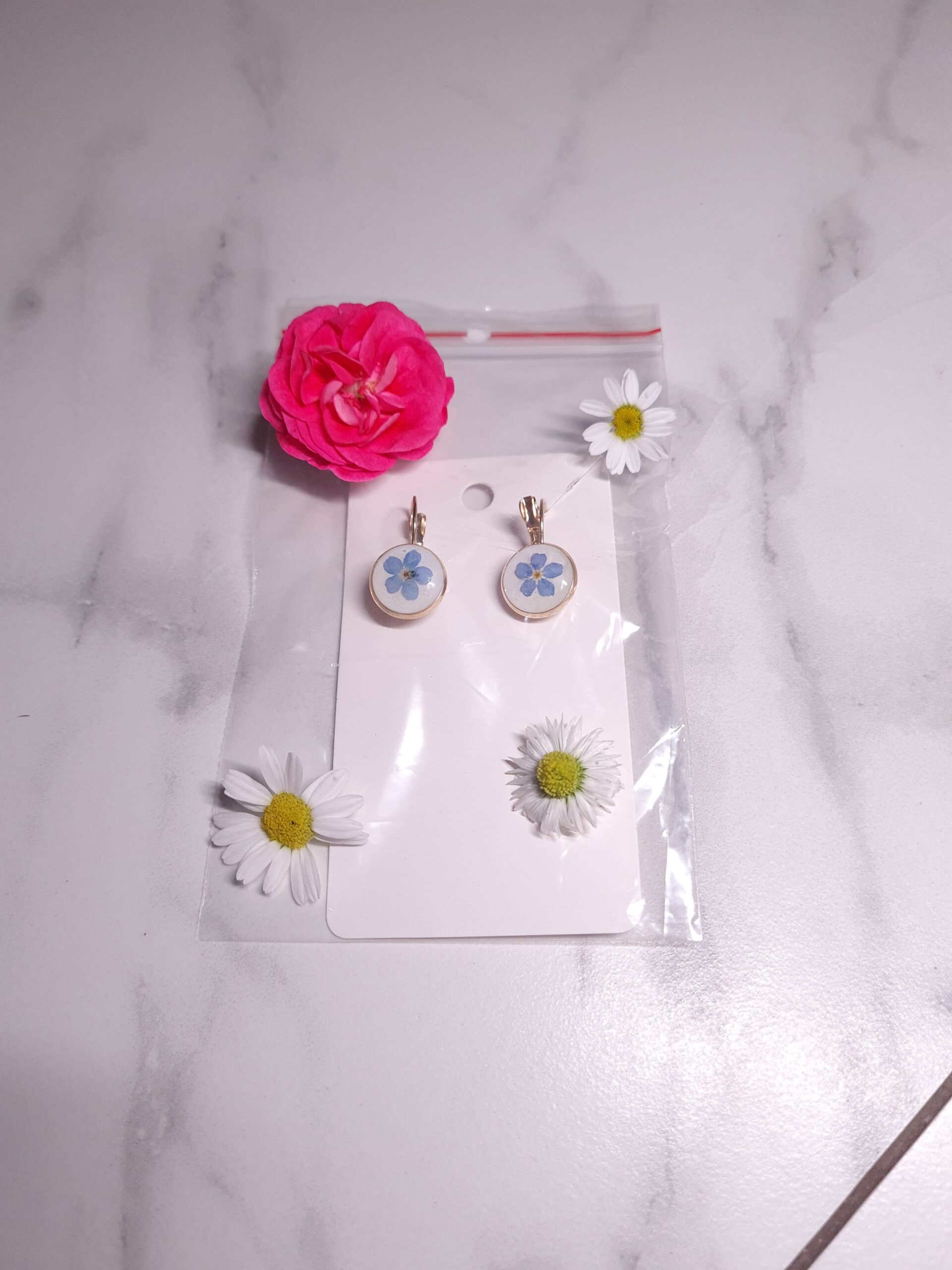 Delikatne, ręcznie wykonane kolczyki z angielskim zapięciem z zatopionymi niezapominajkami – symbolem pamięci, wierności i prawdziwego uczucia.