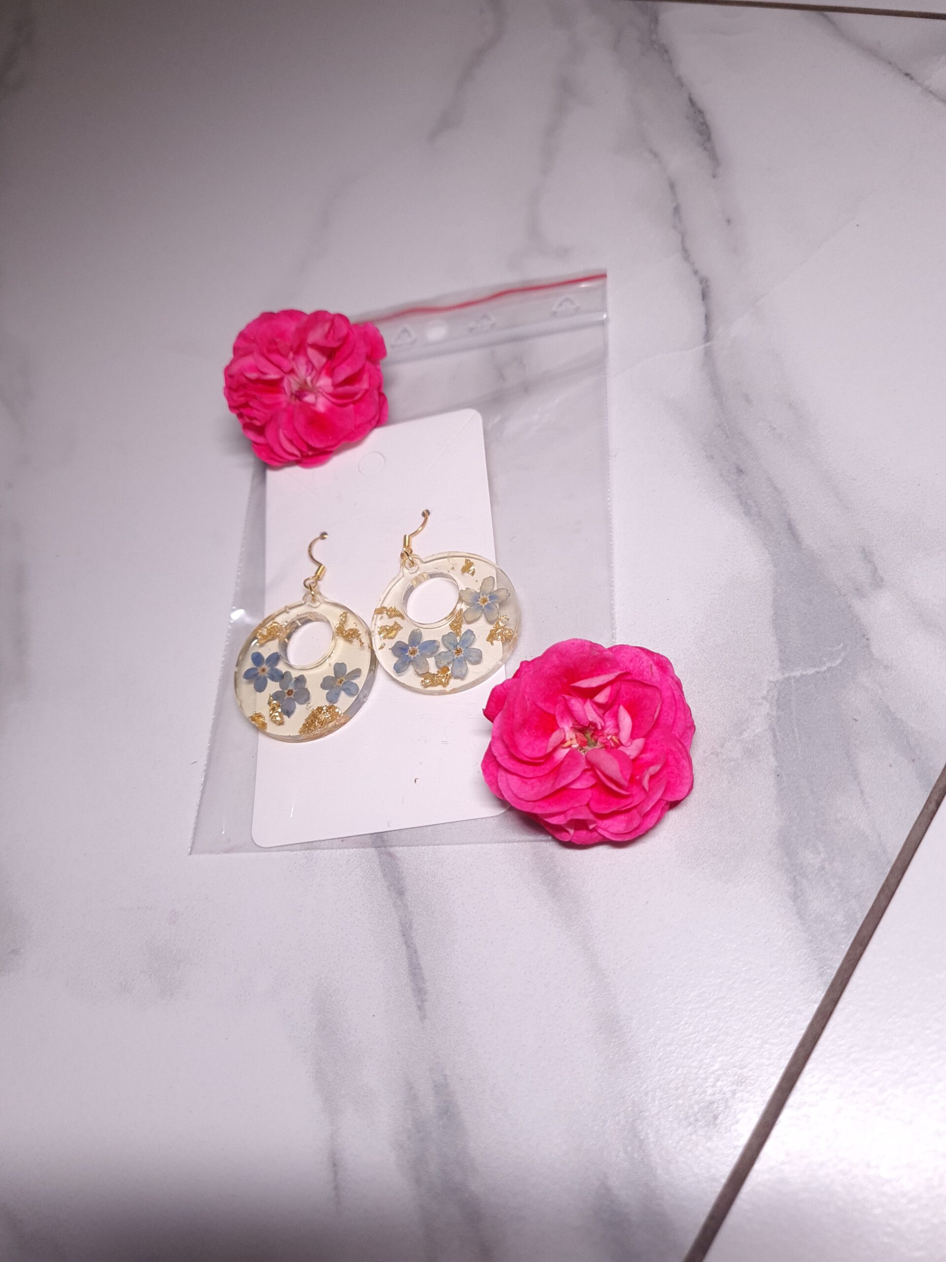 Delikatne, ręcznie wykonane kolczyki wiszące z zatopionymi niezapominajkami – symbolem pamięci, wierności i prawdziwego uczucia.