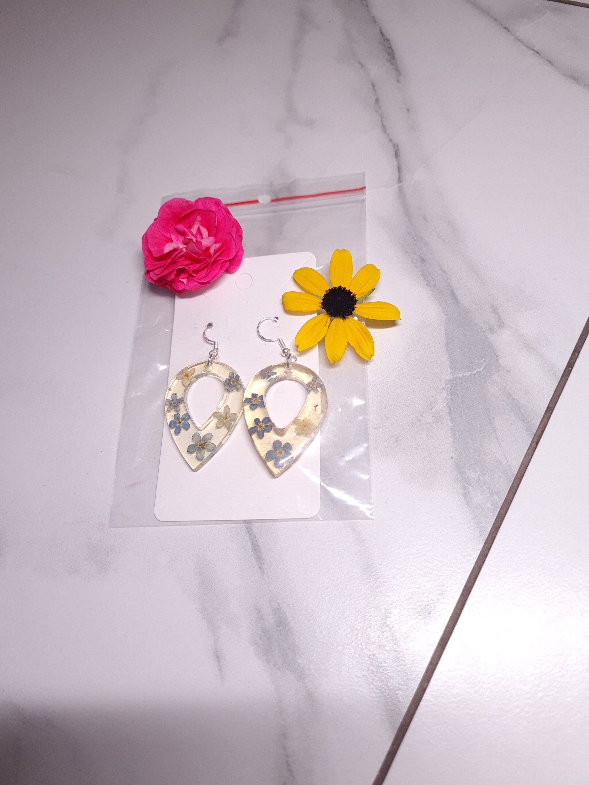 Materiał : żywica z zatopionymi kwiatami niezapominajek, baza hipoalergiczna miedź posrebrzana S925, gumowe zatyczki.