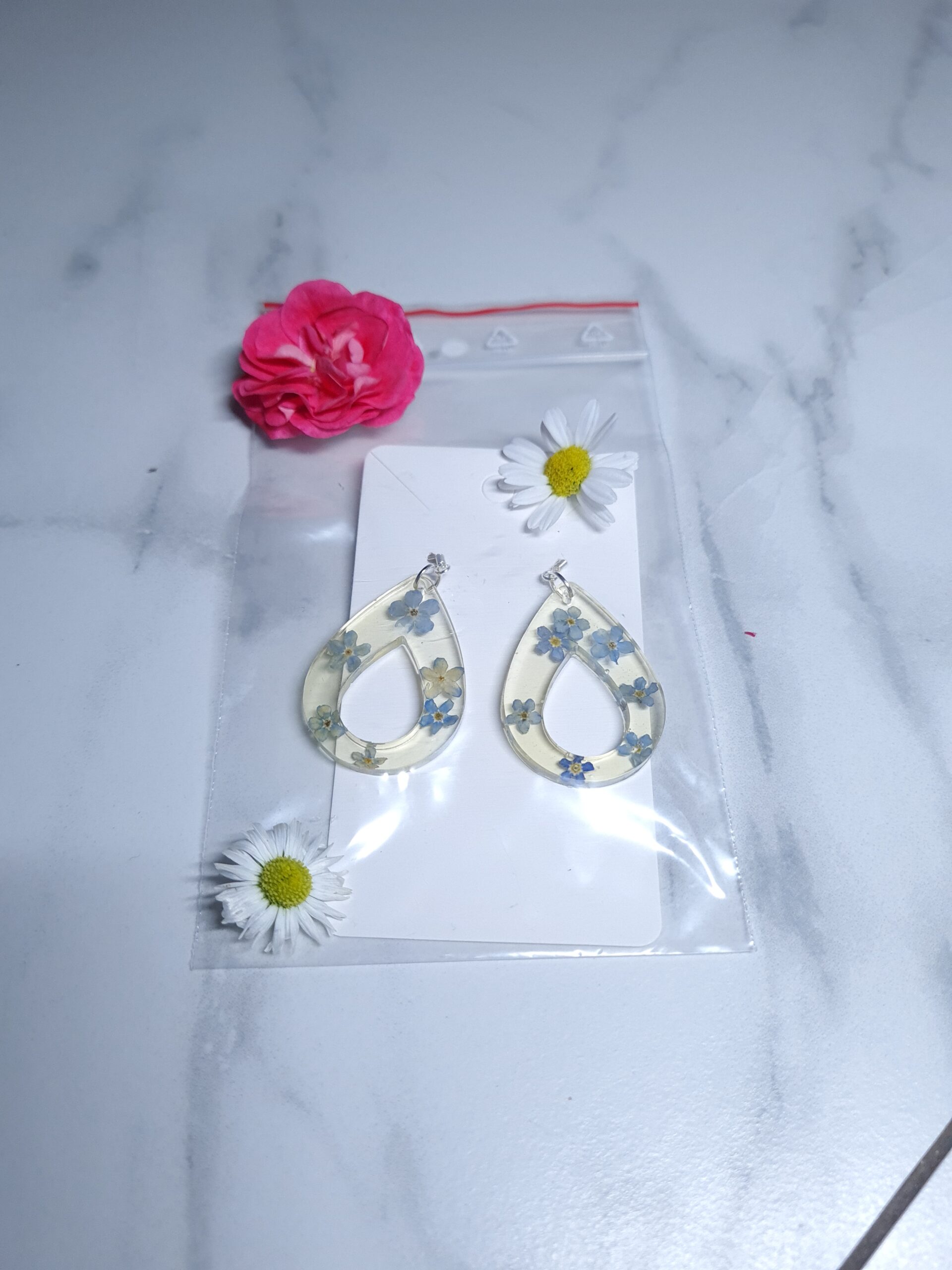 Materiał : żywica z zatopionymi kwiatami niezapominajek, baza hipoalergiczna miedź posrebrzana S925, gumowe zatyczki.