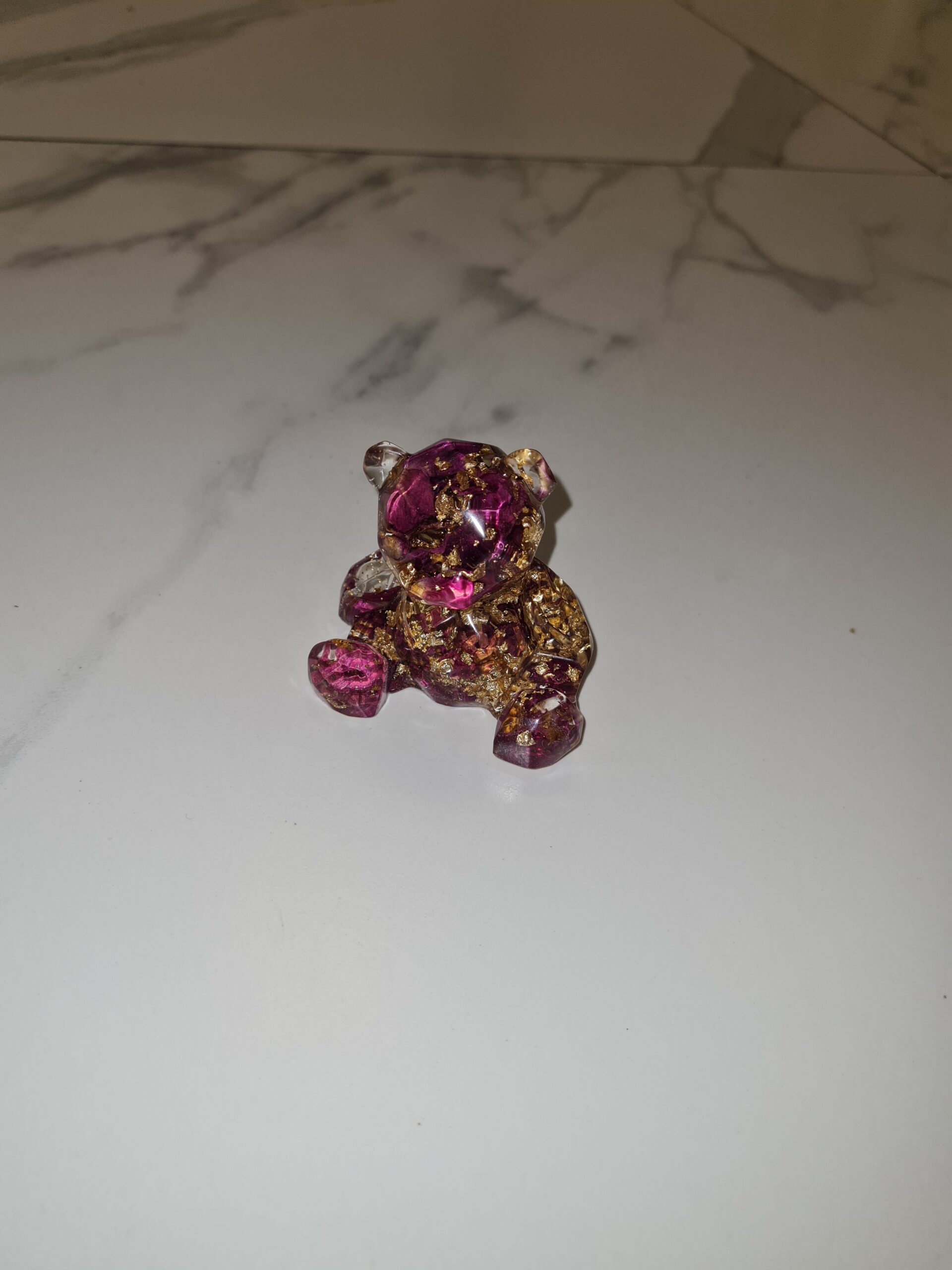 Ręcznie wykonana figurka z żywicy z zatopionymi płatkami róż i złotym akcentem. Delikatnie połyskuje w świetle, dodając wnętrzu harmonii i klimatu. Idealna jako dekoracja na półkę, biurko lub do pokoju dziecka.