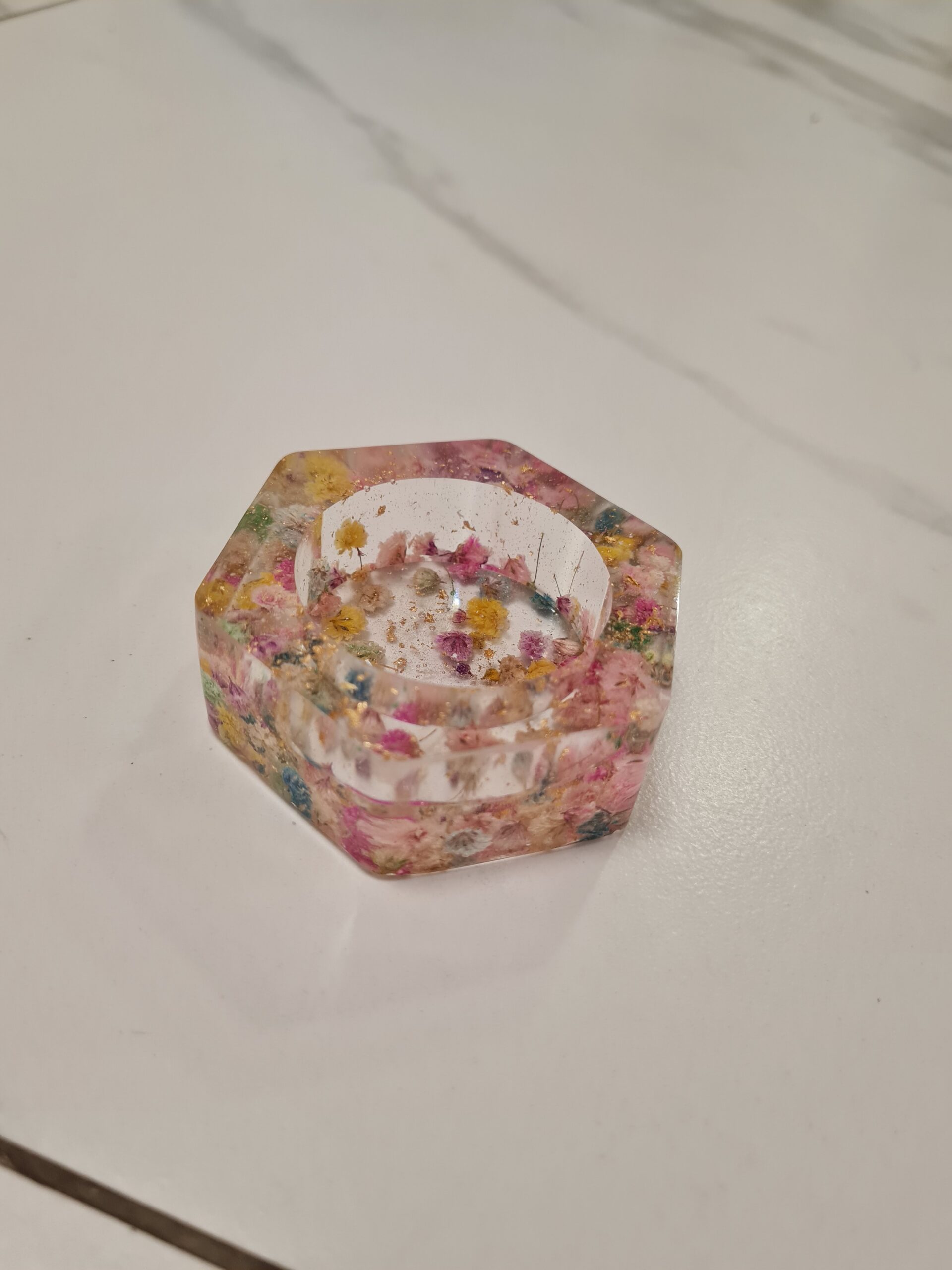 Ręcznie wykonany mały świecznik na tealight, stworzony z transparentnej żywicy, w której zatopiono kolorowe kwiatkiem gipsówki oraz delikatne złote elementy. Każda sztuka to unikat – subtelna i romantyczna ozdoba, która tworzy przytulny klimat i wprowadza do wnętrza nutę elegancji. Idealny do wieczornego relaksu, romantycznej kolacji, dekoracji stołu lub jako urokliwy dodatek do prezentu.
