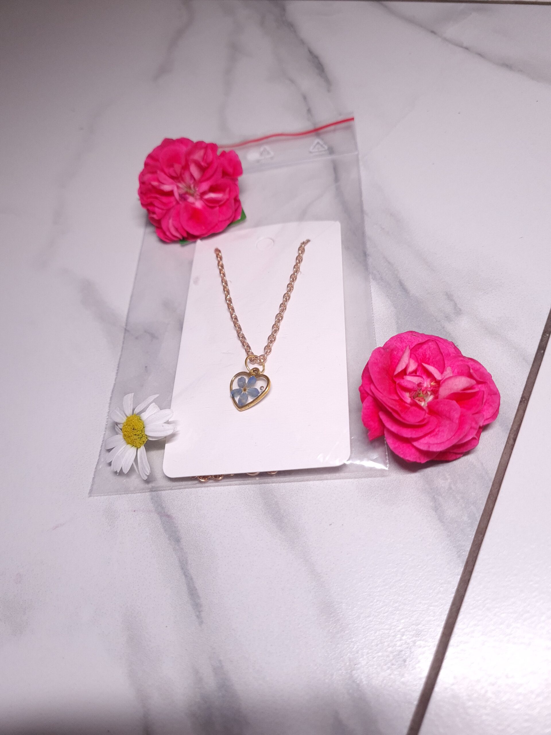 Materiał : żywica z zatopionymi kwiatami niezapominajki, złoty łańcuszek z żelaza, zlota zawieszka ze stopu cynku .